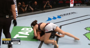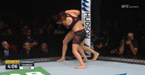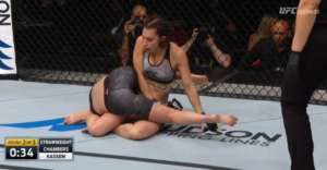 Kassem’s corner screamed for her to pull Chambers’s head down and finish the choke, but she opted to land more punches and elbows before eventually pulling down to attempt to secure the victory. It’s possible that Kassem’s frame, her long legs in particular, were part of the reason this choke was not a success against Chambers. Kassem could have also opted to underhook her opponent’s left side leg in order to stop her from standing up and eventually escaping the position.