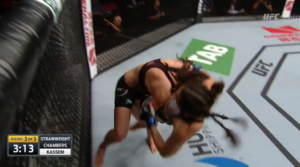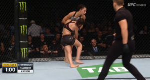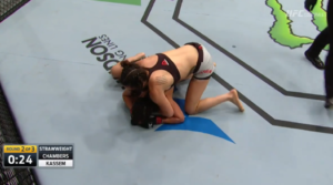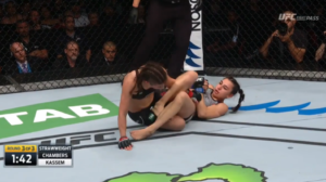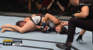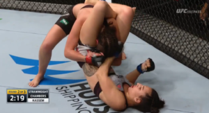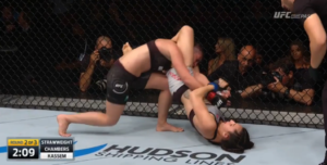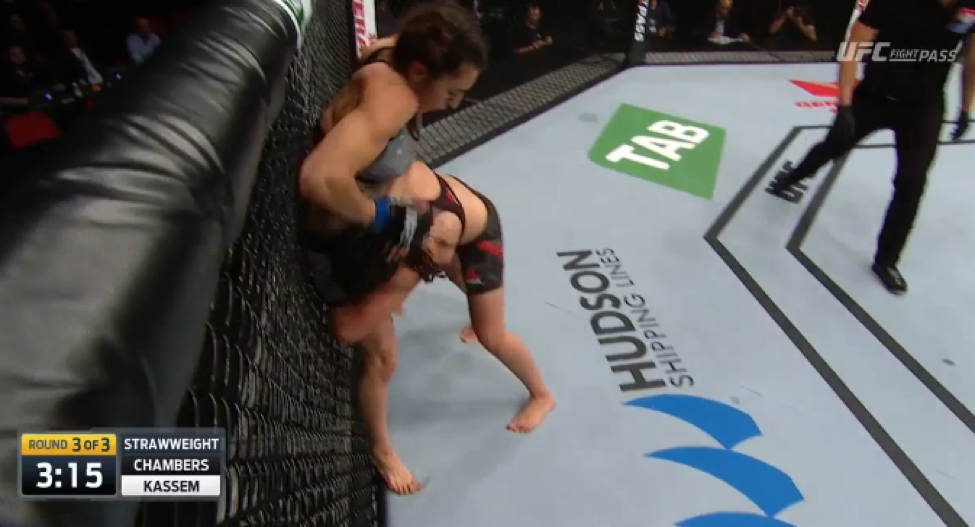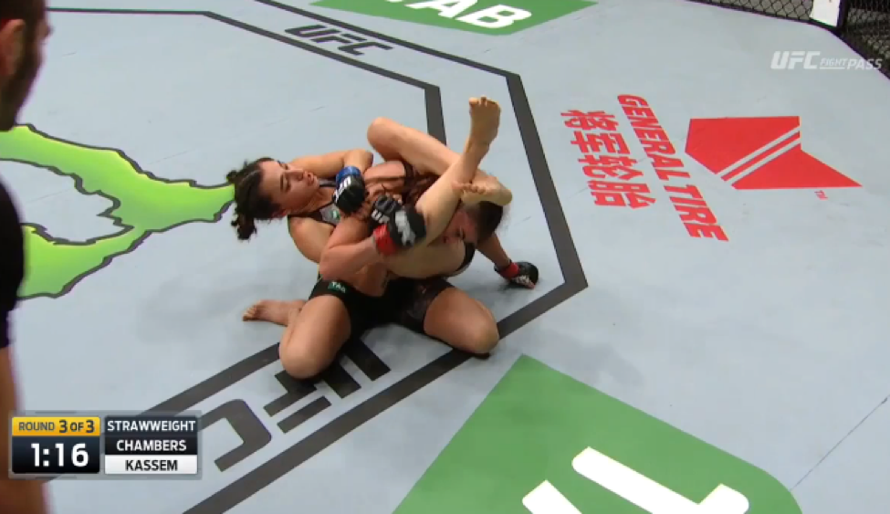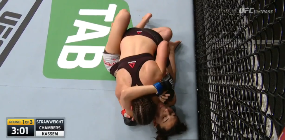 Unable to keep her opponent’s knees wrapped together, Chambers reluctantly followed Kassem back to her feet, where she would work from the body lock to a standing head and arm choke position.