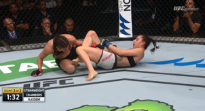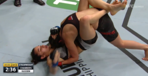 Once again forced to work off her back, Kassem wasted no time in attempting a submission, working first from a crooked guard position to attempt a triangle after Chambers came too far forward in an attempt to pass Kassem’s guard.