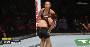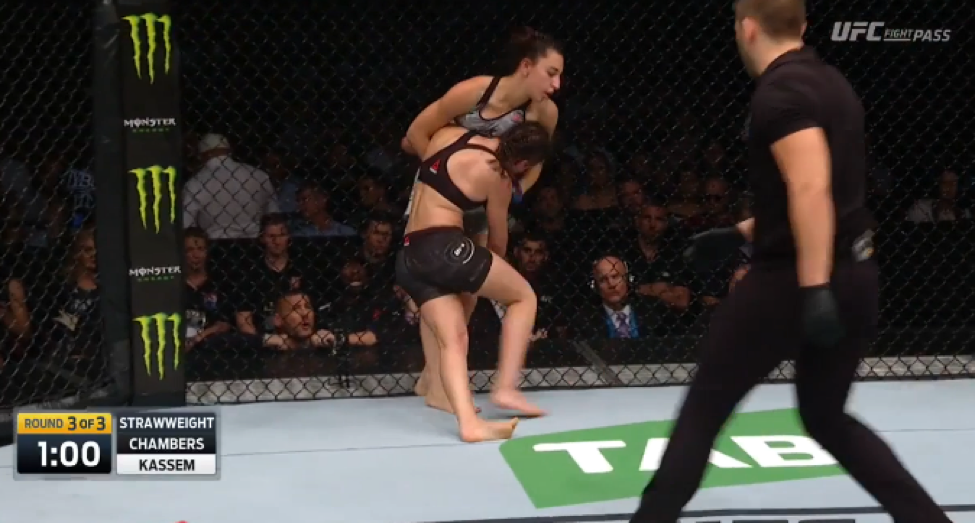 The third and final round began with Kassem landing more heavy kicks to the body of Chambers, who was visibly fatigued by this point. That didn’t stop Chambers from shooting in for another takedown, lifting Kassem and throwing her to the mat as if she were a ragdoll.