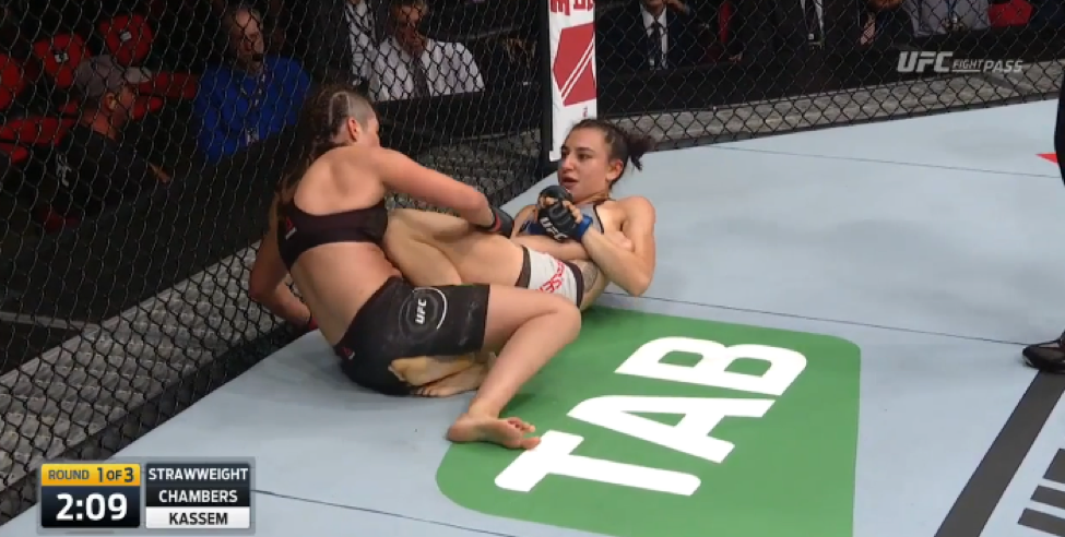 The fight started off with Chambers uncharacteristically taking control of the centre of the octagon and trading strikes with Kassem along the fence before attempting to secure a body lock.